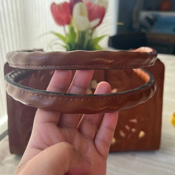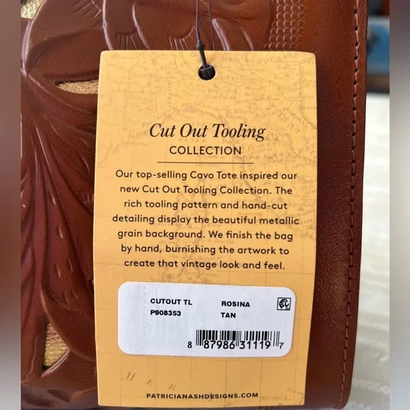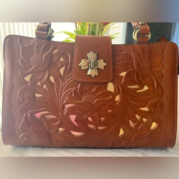NWT Patricia Nash Rosina Leather Cutout Tooled Shoulder Bag13” x 8.5” x 4”100% full-grain leather with magnetic snap closureSuede lining Dual twisted leather rope handles and ample pockets to keep essentials organizedInterior: 1 rear slip pocket and 1 front slip pocket with magnetic snap closure, main zipper compartment with 1 rear zip pocket, 2 front slip pocketsExterior: 1 rear pocket with magnetic snap closureNo callouts Comes from a smoke free home