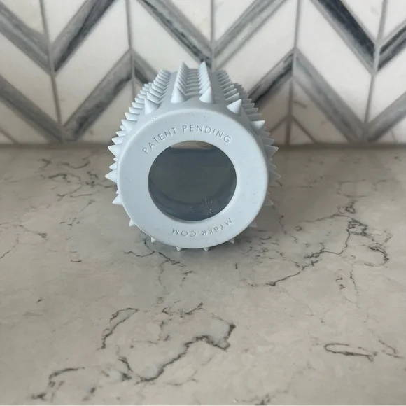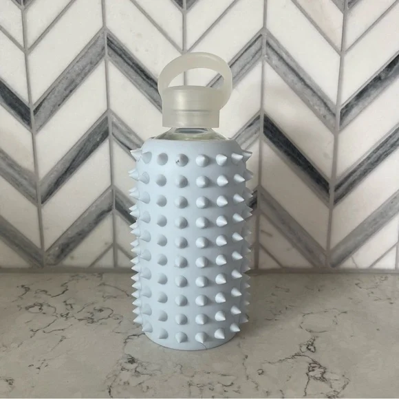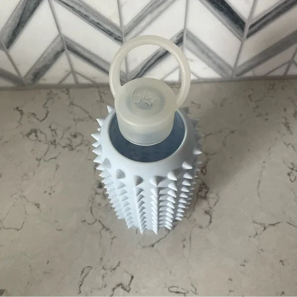 This is called the Little Spiked bkr. The Little holds up to 500ml (16 oz) and fits in your tote bags, your backpack, your travels, and your life for everyday drinking.Our little spiked water bottles are not only très chic, they also provide life-changing grip for people with mobility issues and are better than a fidget spinner for anxiety..The spikes are both firm and soft and feel great in your hand.Grace Color (opaque baby blue)