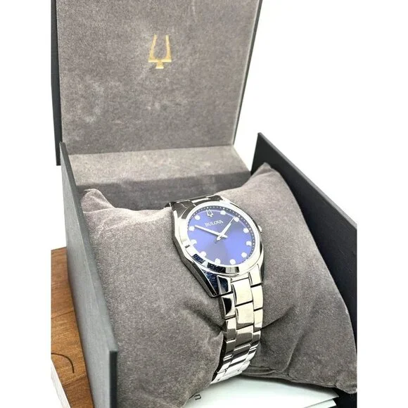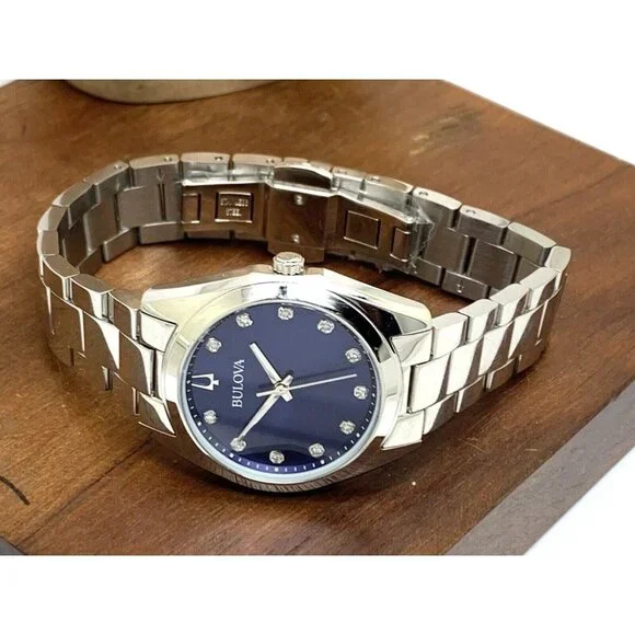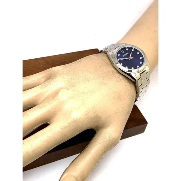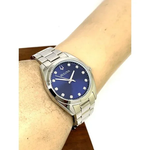 Bulova Women's Watch 96P229 Surveyor Quartz Blue Dial Diamond Silver Steel 31mm $360 (K4503Y)Pre-owned. Runs great. Has some scuffs on the bezel, case & band (see photos).Sold with box & bookletBand fits up to apx 7.5'' inches wrist size(Please make sure it is the right size for you)Case is apx 31mm (excluding the crown)Please email with any questions and check out our other items