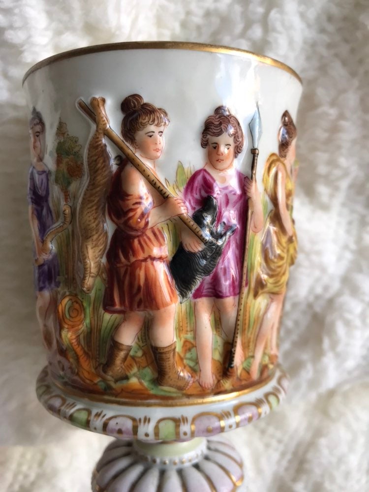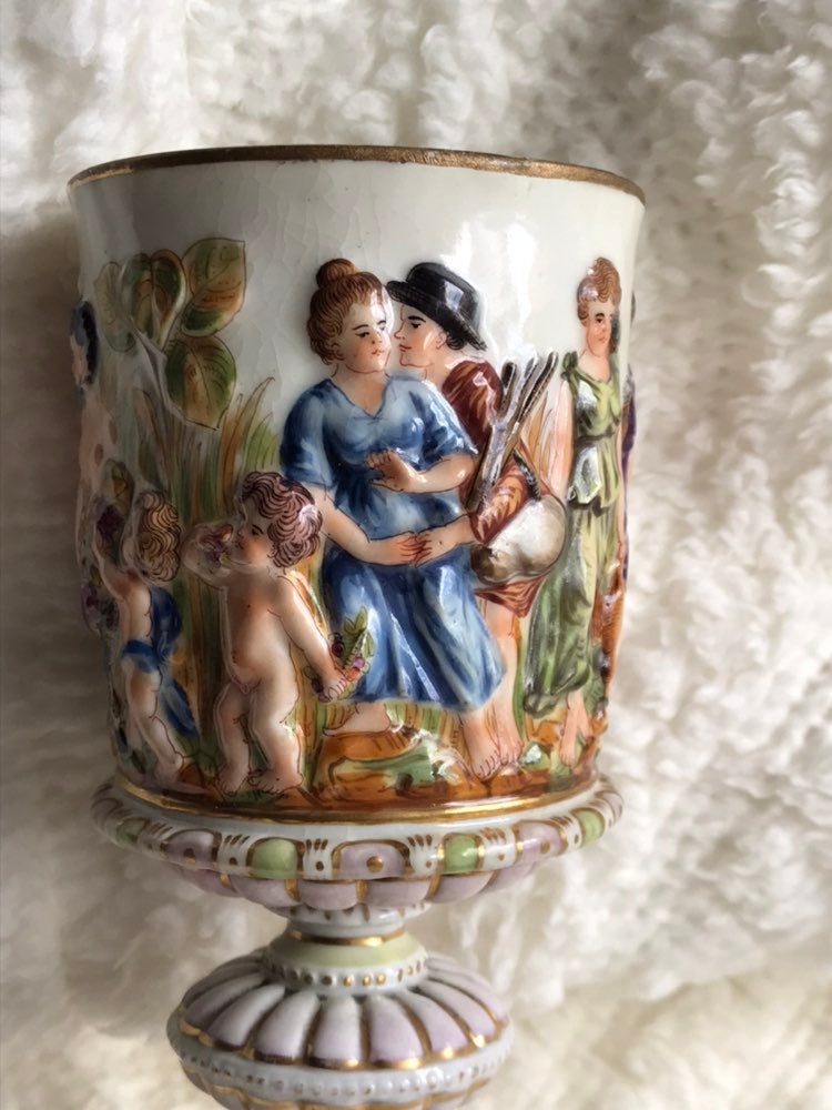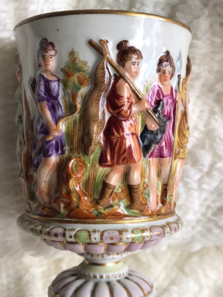 This beautiful Capodimonte Chalice is from the mid 18th century. It features multiple scenes, from Amazonian women and lovers to Satyrs and dogs and many things in between. The 3D raised relief porcelain is in excellent bright condition which is outstanding for it’s age. It’s gilded with real 24k gold.